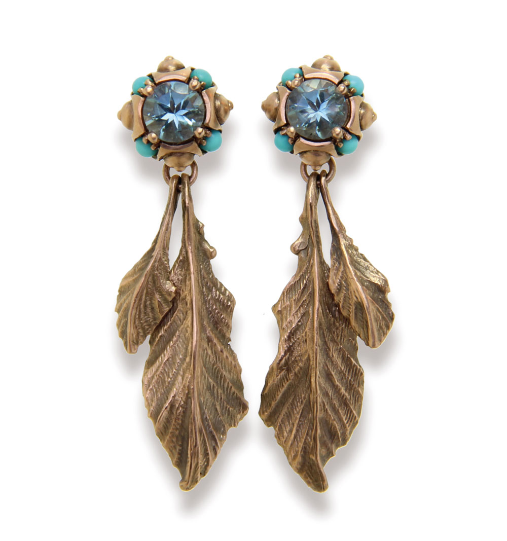 Ohrstecker in Rotgold (Blatt abnehmbar) mit Aquamarin und Türkisen von André Schweiger, Zug.