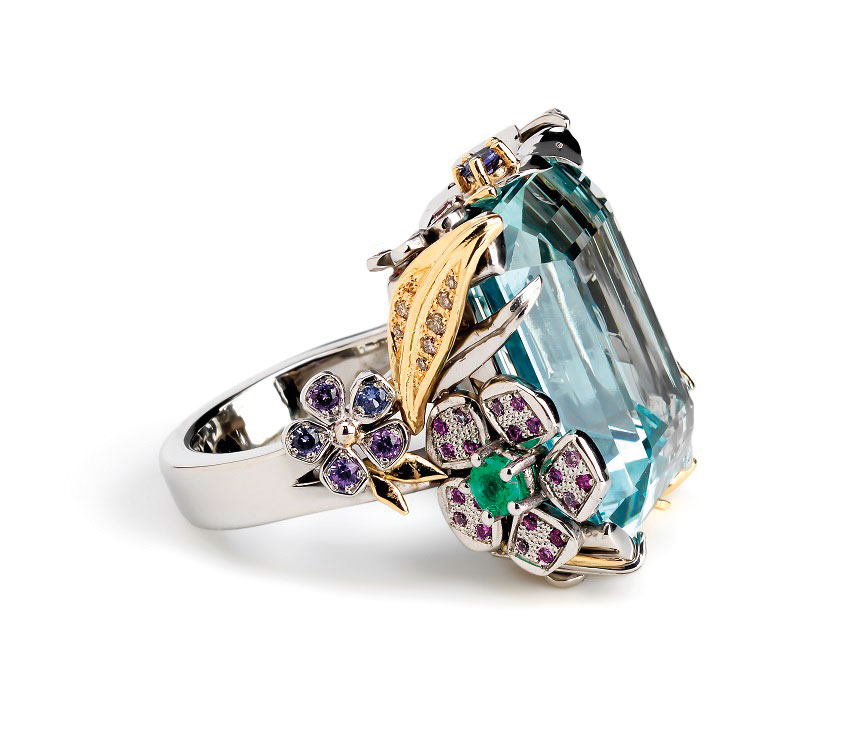 Der spielerische und hochwertige Ring aus der St. Galler Goldschmiede von Eveline Frischknecht in Weissgold 750 ist mit einem Aquamarin und kleinen Farbsteinen besetzt.