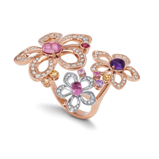 Flower Power à la Gübelin Jewellery: Der skulpturale Ring „Lily Dew“ aus Rot- und Weissgold ist mit zwei rosafarben Saphiren im Cabochonschliff, einem Amethysten im Cabochonschliff, pastellfarbenen Saphiren und Brillanten besetzt.