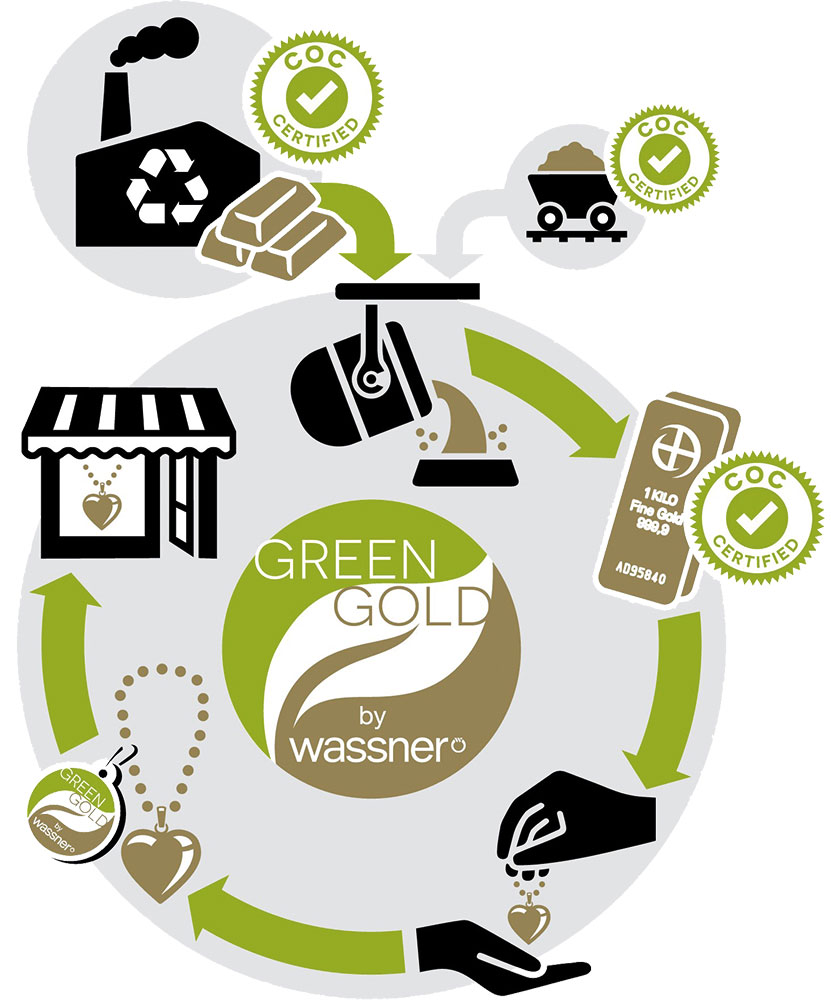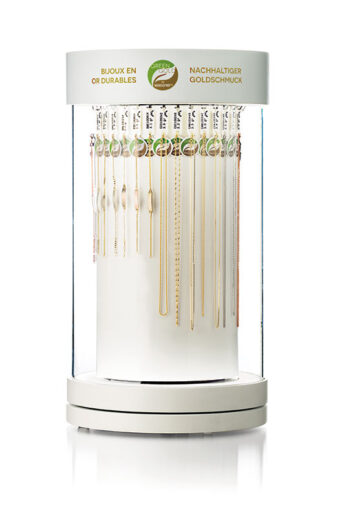 Ein Höhepunkt des Jubiläumsjahres ist die Entwicklung der Tischvitrine der Marke Green Gold by Wassner. Diese wurde gezielt für den Verkaufspunkt entworfen und macht nachhaltigen Schmuck erlebbar. Präsentiert werden können Anhänger-Colliers, Bébé-Bracelets sowie alternativ oder ergänzend Bracelets in feinen bis breiten Ausführungen. Die Vitrine bietet Platz für 35 Schmuckstücke aus dem Sortiment von Green Gold by Wassner und ermöglicht eine übersichtliche und hochwertige Warenpräsentation. Für den Fachhandel bedeutet dies mehrere Vorteile: eine erhöhte Sichtbarkeit der Produkte, ein schnellerer Abverkauf, gezielte Impulse für Zusatzverkäufe sowie eine klare Kommunikation des Nachhaltigkeitsthemas direkt am Verkaufspunkt. Die Vitrine ist vollständig in das bestehende Point-of-Sale-Konzept integriert und wird den Partnergeschäften kostenfrei zur Verfügung gestellt.