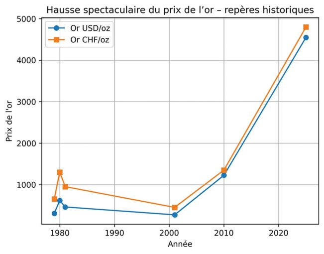Sur l’ensemble de l’année 2025, l’or a progressé d’environ 70 pour cent, franchissant à plusieurs reprises le seuil des 4500 dollars américains l’once* pour culminer autour de 4549 dollars américains à la fin décembre. Une performance historique rarement observée en dehors des périodes de crise aiguë. L’argent, fidèle à sa réputation de métal hypersensible, a littéralement explosé, dépassant les 80 dollars américains l’once, soit une envolée de plus de 150 pour cent sur l’année. Longtemps considéré comme le plus «noble» des métaux précieux, le platine, plus rare que l’or, a vu son cours bondir jusqu’à plus de 2400 dollars américains l’once en fin d’année 2025, bien au-delà de sa moyenne historique. Quels chocs!