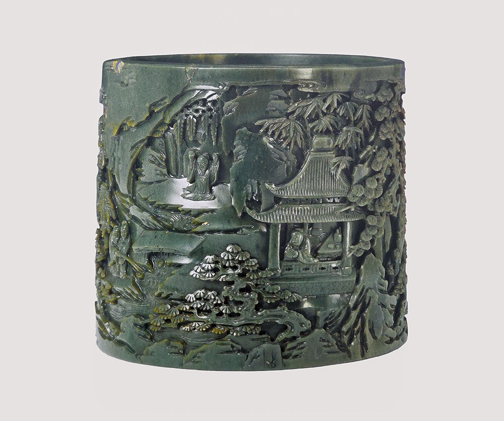 Photo: Ce pot à pinceaux dont le décor est taillé, en relief, dans de la néphrite vert foncé, fera partie de la quarantaine de pièces exposées à GemGenève. Il représente la réunion des Sages au pavillon des Orchidées. Photo: Fondation Baur, Musée des Arts d’Extrême-Orient, Genève. Photo: Marian Gérard