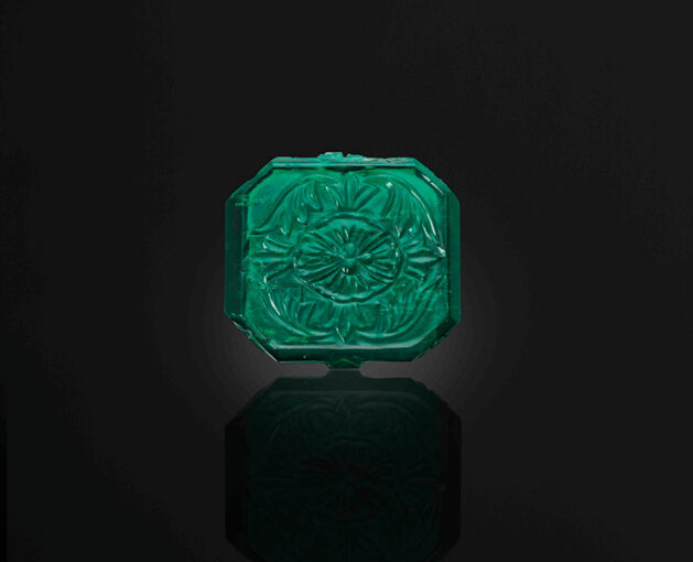 Les grandes émeraudes mogholes (en photo 6,2 x 2,5 x 0,5 cm ) étaient souvent gravées d’inscriptions ou de motifs floraux. Leur taille exceptionnelle en faisait des présents diplomatiques réservés aux élites de l’Empire moghol. The Al Thani Collection.