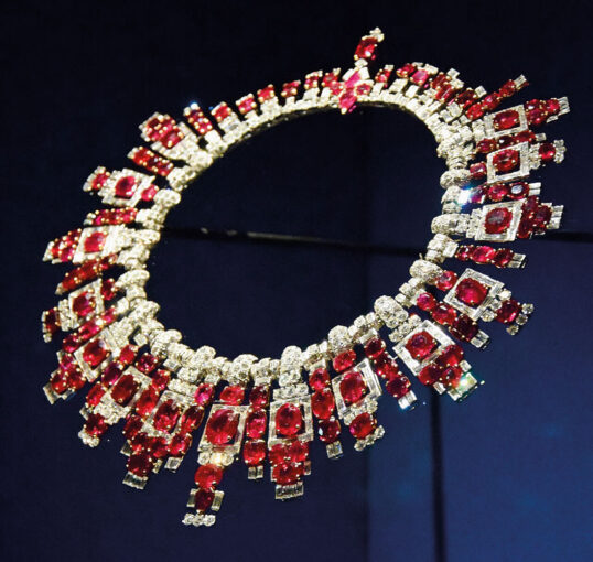 Collier Nawanagar, Cartier Londres, 1937. Commandé par le maharajah de Nawanagar, ce collier de diamants et rubis était si spectaculaire qu’on raconte qu’il fit passer toutes les parures royales pour de simples accessoires de salon. The Al Thani collection.