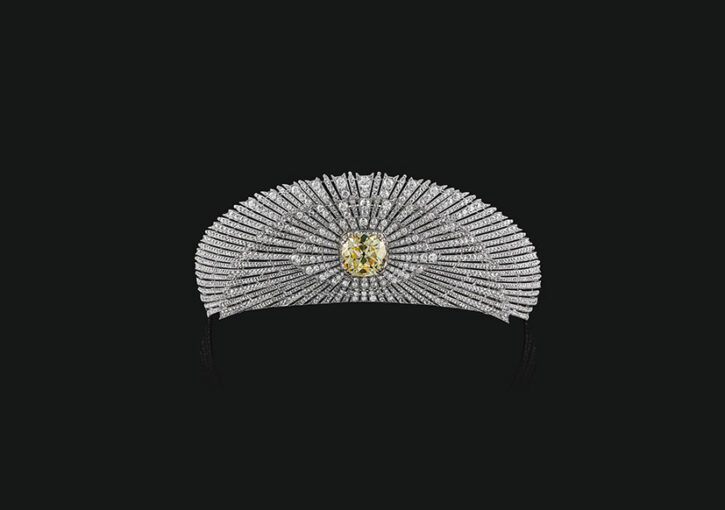 Diadème Soleil, Cartier 1907. Avec ses rayons de diamants émergeant d’une pierre centrale jonquille (Fancy Vivid Yellow), ce chef-d’oeuvre parisien faisait tourner toutes les têtes lors des réceptions (dim. 14,0 x 17,0 x 9,5 cm). The Al Thani Collection.