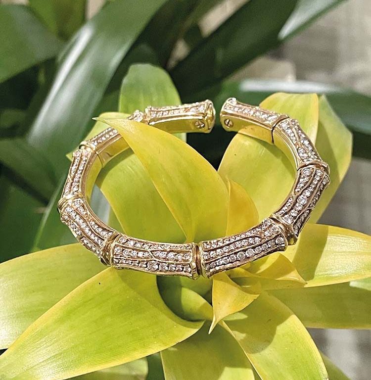Dans la joaillerie, le bambou demeure une source d’inspiration inépuisable. Ses lignes filiformes, ses rythmes naturels et ses courbes organiques séduisent par leur élégance. Certaines créations reprennent la délicatesse des ligatures de ses nœuds, d’autres transposent la souplesse de ses tiges élancées dans des broches, tandis que des pendentifs suggèrent la rupture du tronc, serti de touches de jade vert.