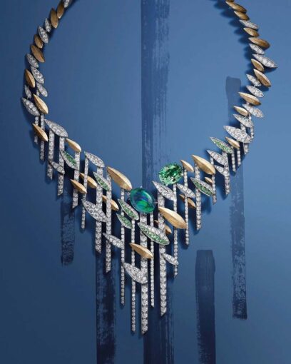 Chaumet a dévoilé récemment, une capsule de haute joaillerie baptisée «Bamboo», célébrant ses 240 ans naturalistes et rendant hommage à l’Asie. Dix pièces en or jaune et blanc gravées du motif végétal composent cette collection, dont un spectaculaire collier plastron, à la fois graphique et organique, incarnation joaillière de la souplesse du bambou.