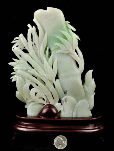 Les creux et la transparence, attributs essentiels à la philosophie zen et à l’esthétique du vide, se prêtent parfaitement au travail des pierres translucides à opaques telles la jadéite (originaire de Birmanie), la néphrite, l’émeraude ou la chrysoprase. La jadéite et la néphrite sont des pierres précieuses très résistantes aux chocs. La première est réputée pour sa grande dureté (résistance à l’usure, à l’abrasion), la seconde, un peu plus tendre, se sculpte plus aisément. Deux expressions d’une même symbolique de force et de longévité. L’orfèvrerie, quant à elle, traduit en relief ou en gravure la nervure d’une feuille, ou suggère le froissement d’une canopée dans un collier.