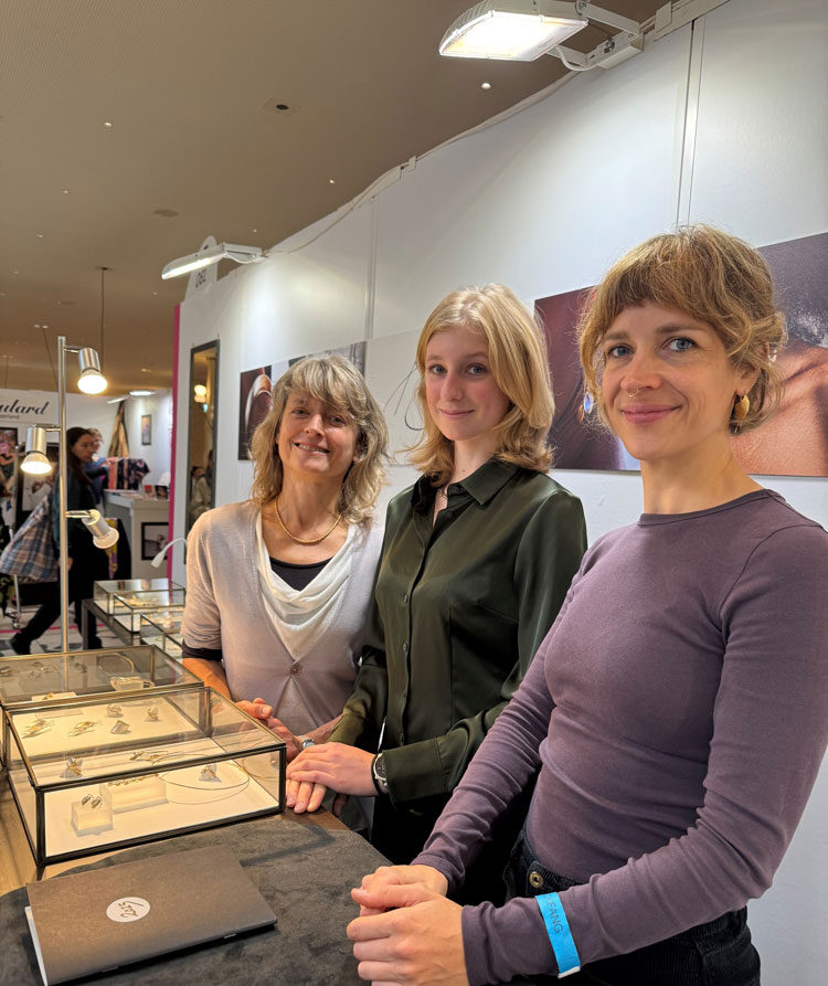 Mitte November lockte die Designmesse Blickfang viel Publikum ins Zürcher Kongresshaus. Mit dabei waren auch ein paar Schmuckgestalter und Goldschmiedinnen. Unter ihnen beispielsweise Anna Schmid aus Basel, die mit ihrem Team dort schon zum fünften Mal ihre Eigenkreationen präsentierte. „Diese Messe ist für uns nachhaltig“, sagt sie. „Neben den Verkäufen vor Ort nehmen zahlreiche Leute ein Visitenkärtchen mit und melden sich später bei uns“. Bei Paaren seien es oft Männer, die die Karte „heimlich“ einsteckten, um ihre Frauen mit dem einen oder anderen Stück zu überraschen. Zum Team von Anna Schmid Schmuck gehört auch Ella Stingerlin. Die Lernende im vierten Lehrjahr zeigt sich begeistert. „Es ist spannend, hier unsere Kreationen zeigen zu dürfen, und ich kann mich während den drei Tagen intensiv im Verkauf üben“, sagt sie. db
