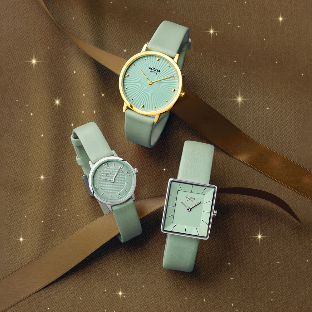 Mit Blick auf die Weihnachtstage stellt Boccia salbeigrüne Uhren aus Titan vor. Das Gehäuse ist eckig oder rund und wird auch goldplattiert angeboten. Die Lederbänder verbinden Komfort mit Eleganz, indem sie die zarte Farbe des Zifferblatts aufgreifen. Die goldplattierte Uhr ist bis 5 bar wasserdicht, die beiden silbernen Modelle bis 3 bar. Indexpunkte, -striche oder ein Wechselspiel mit arabischen Ziffern sorgen für das sichere Ablesen der Uhrzeit. In der Schweiz werden die Uhren von der Firma Le Temps of Switzerland GmbH vertrieben.